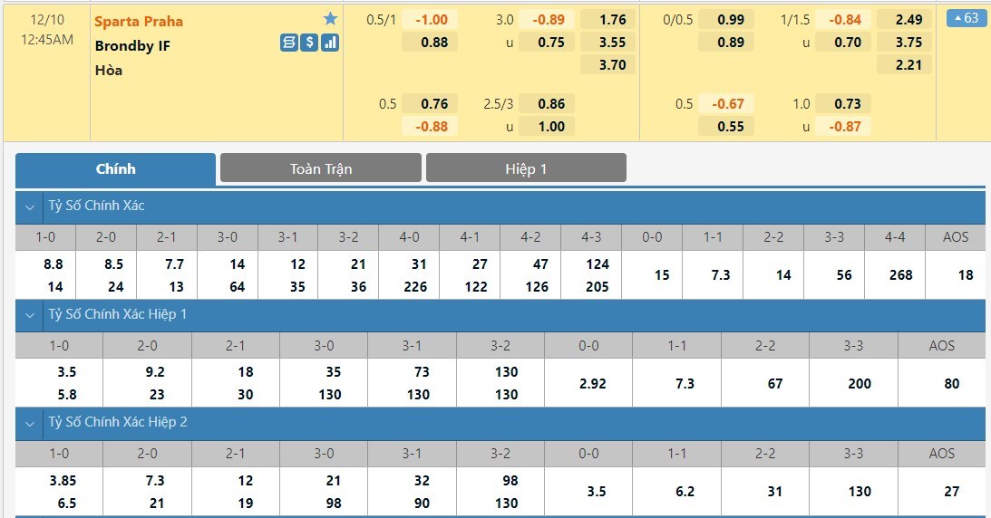 Tỷ lệ kèo cá cược bóng đá trận Sparta Praha vs Brondby