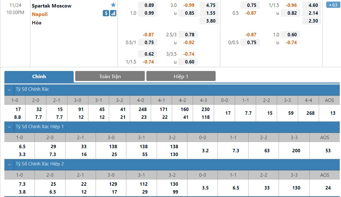 Tỷ lệ kèo cá cược bóng đá trận Spartak Moscow vs Napoli
