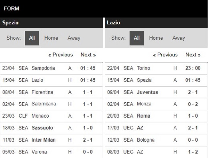 Thống kê phong độ Spezia vs Lazio
