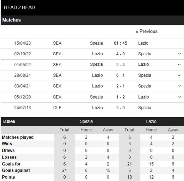 Thống kê đối đầu Spezia vs Lazio
