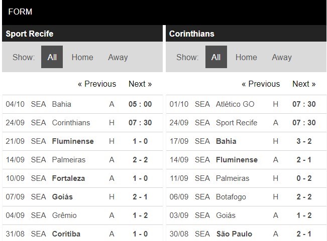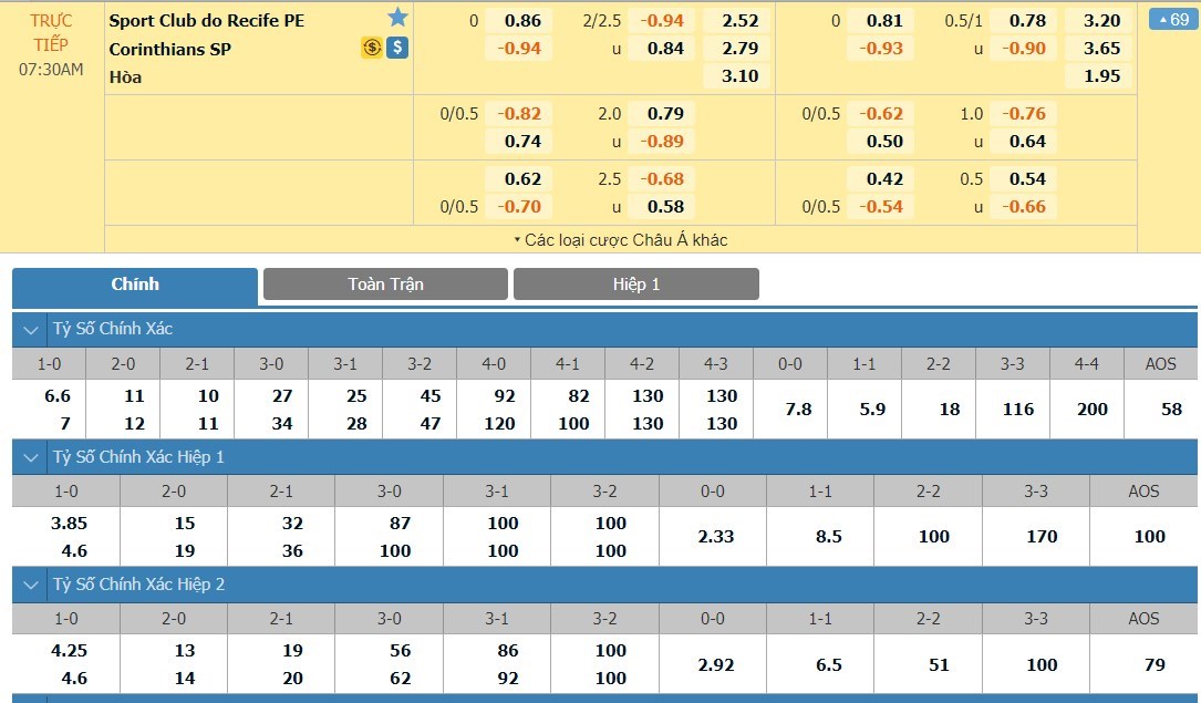 Xem tỷ lệ kèo cá cược bóng đá trực tuyến Sport Recife vs Corinthians
