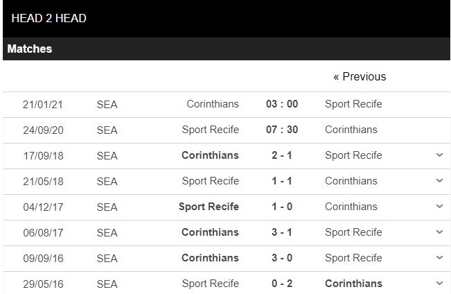Trong 6 cuộc đối đầu gần nhất giữa Sport Recife và Corinthians thì có 4 trận đấu chứng kiến hiệp 1 khép lại với tỷ số hòa không bàn thắng. Ở 3 vòng đấu gần đây, Corinthians chỉ ghi được 1 bàn thắng trong thời gian hiệp đấu đầu tiên. Sport Recife là đội bóng chọn cách vào trận chậm rãi nhưng họ cũng có được bàn thắng ở hiệp 1 tại 2 vòng đấu liên tiếp gần đây.