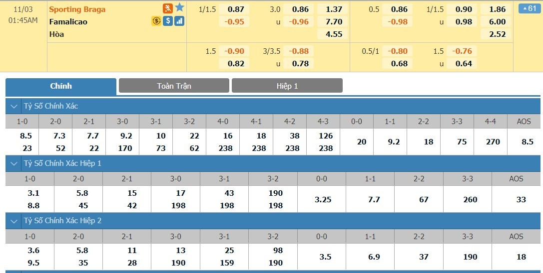 Tỷ lệ kèo cá cược bóng đá trực tuyến trận Sporting Braga vs Famalicão