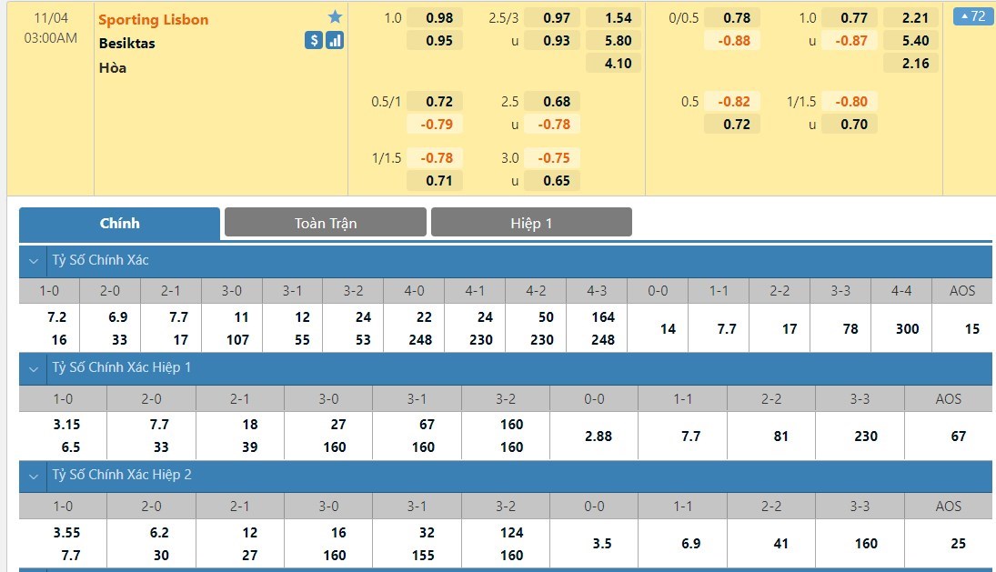 Tỷ lệ kèo cá cược bóng đá trận Sporting Lisbon vs Besiktas