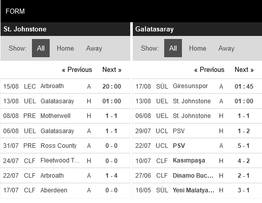 Vấn đề ghi bàn của St. Johnstone rõ ràng là rất nặng nề. Trong 10 trận gần nhất của đội bóng này trên mọi đấu trường, có tới 9 trận xuất hiện nhiều nhất 1 bàn thắng. Trong số này có tới 5 trận hết hiệp 1 mà kết quả là 0-0. Galatasaray cũng đang gặp đôi chút rắc rối về hàng công và 2 trận gần nhất của họ có kết quả hiệp 1 là 0-0 và 0-1.