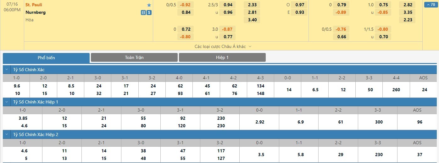 Tỷ lệ kèo cá cược bóng đá trận St. Pauli vs Nurnberg