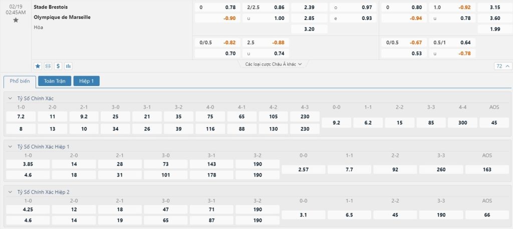 Xem tỷ lệ kèo cá cược bóng đá trực tuyến Stade Brestois vs Marseille