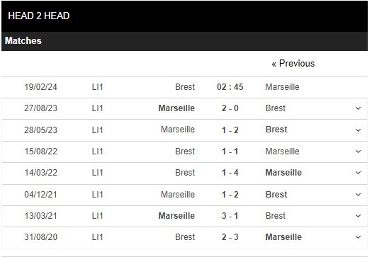 Thống kê đối đầu Stade Brestois vs Marseille