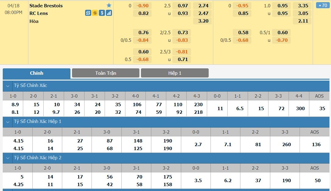 Tỷ lệ kèo cá cược bóng đá trận Stade Brestois vs RC Lens