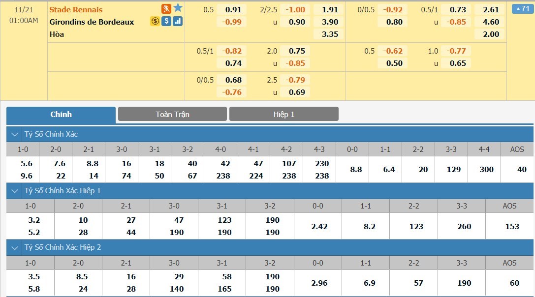 Tỷ lệ kèo cá cược bóng đá trận Stade Rennais vs Bordeaux