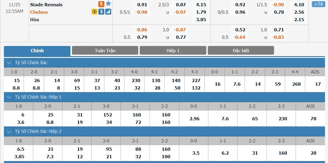 Xem tỷ lệ kèo cá cược bóng đá trực tuyến Stade Rennais vs Chelsea