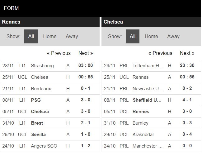 Thống kê phong độ Stade Rennais vs Chelsea