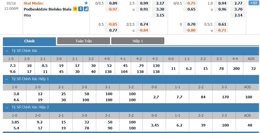 Tỷ lệ kèo cá cược bóng đá trận Stal Mielec vs Podbeskidzie Bielsko-Biala