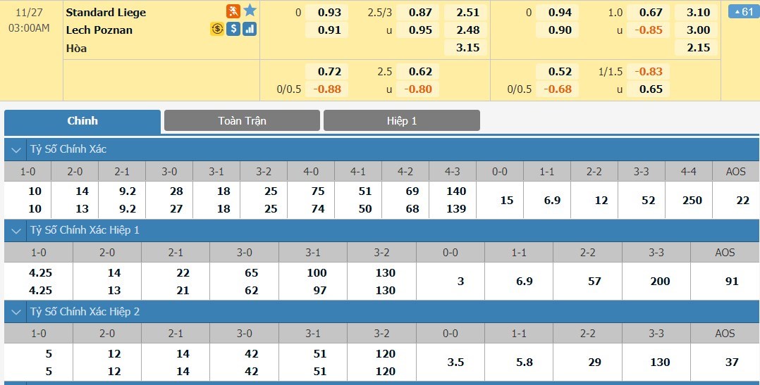 Tỷ lệ kèo cá cược bóng đá trận Standard Liege vs Lech Poznań