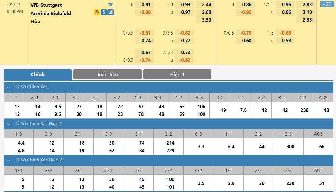 Tỷ lệ kèo cá cược bóng đá trận Stuttgart vs Arminia Bielefeld