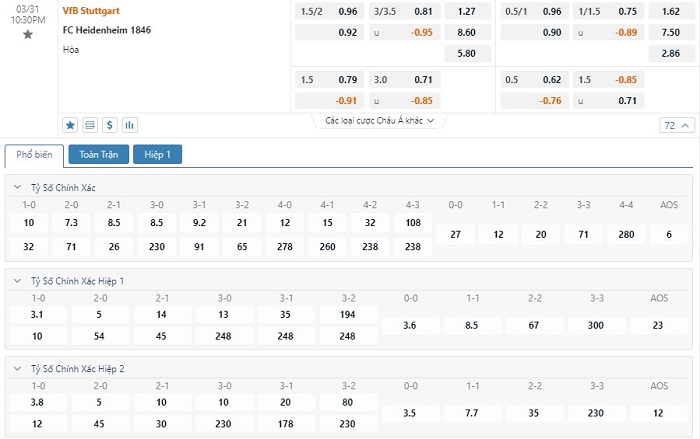 Tỷ lệ kèo cá cược bóng đá trực tuyến trận Stuttgart vs Heidenheim