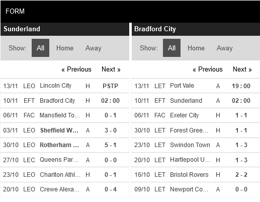Thống kê phong độ Sunderland vs Bradford