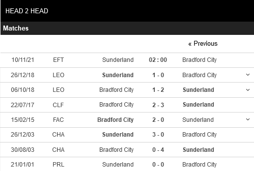 Thống kê đối đầu Sunderland vs Bradford