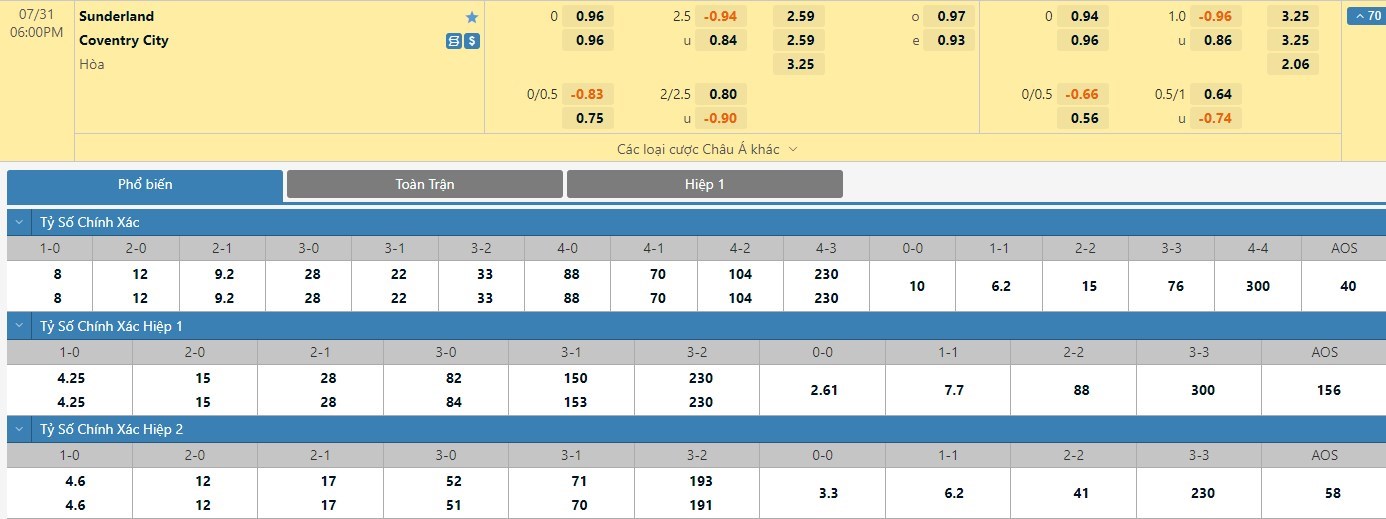 Tỷ lệ kèo cá cược bóng đá trực tuyến trận Sunderland vs Coventry