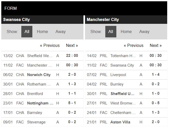 Thống kê phong độ Swansea vs Manchester City