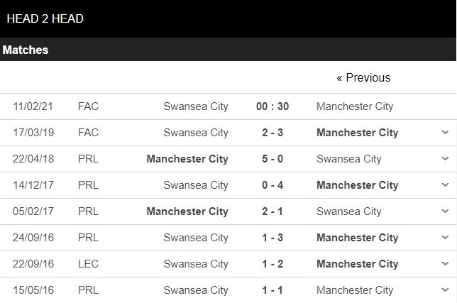 Thống kê đối đầu Swansea vs Manchester City