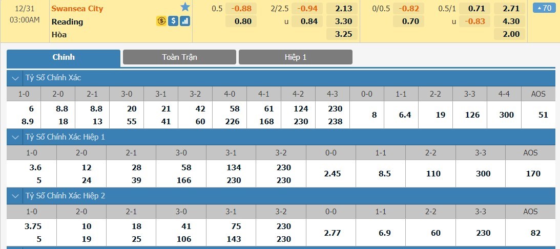 Tỷ lệ kèo cá cược bóng đá trận Swansea vs Reading
