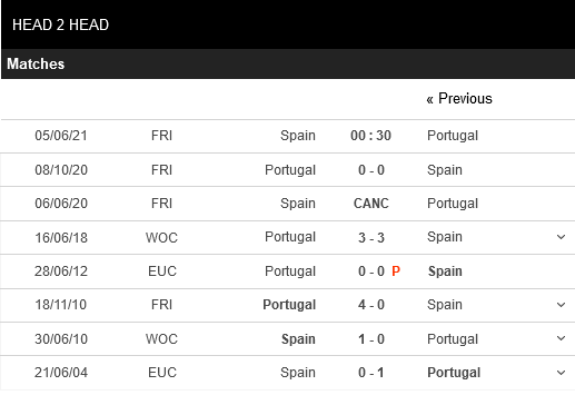 Thống kê phong độ Tây Ban Nha vs Bồ Đào Nha