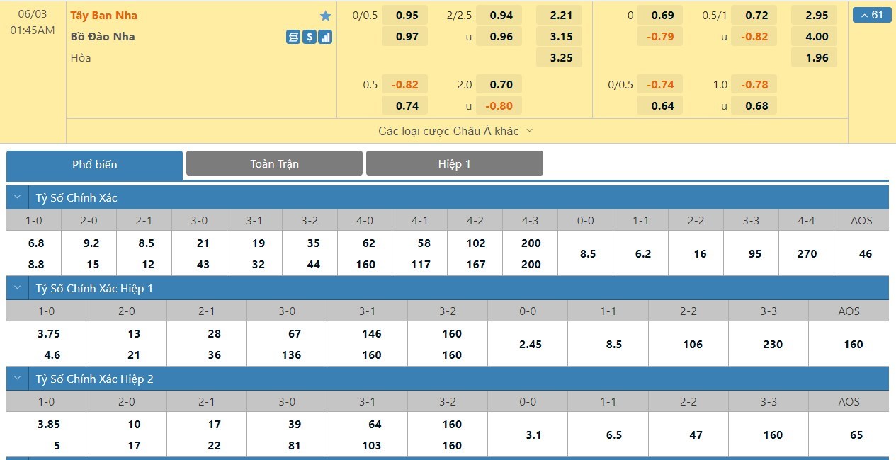 Tỷ lệ kèo cá cược bóng đá trực tuyến trận Tây Ban Nha vs Bồ Đào Nha