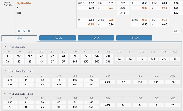 Xem tỷ lệ kèo cá cược bóng đá trực tuyến Tây Ban Nha vs Italia