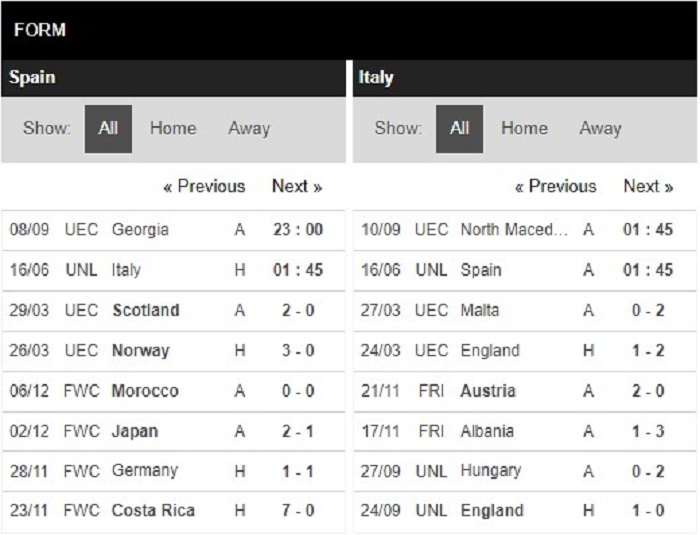 Thống kê phong độ Tây Ban Nha vs Italia