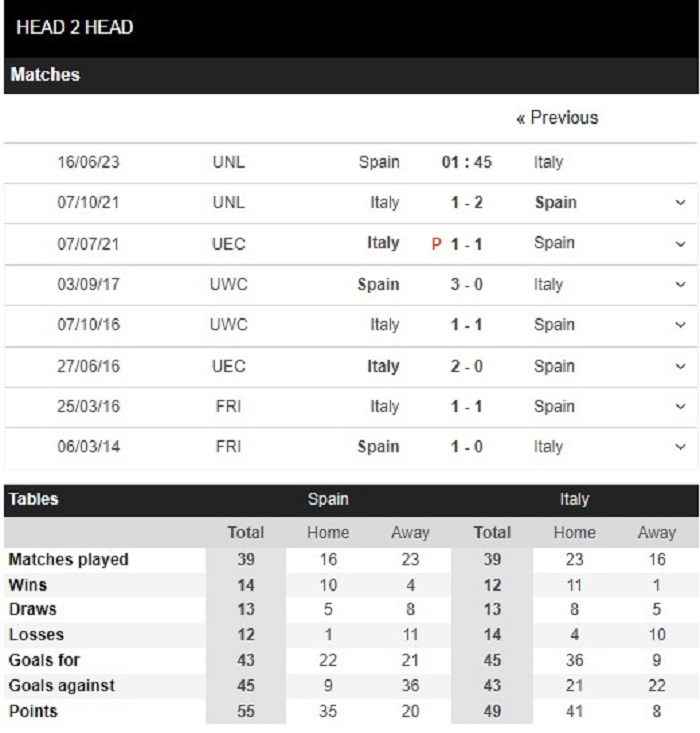 Trong 10 lần đối đầu gần nhất giữa hai đội bóng này thì có tới 7 trận đấu khép lại mà không vượt qua mốc 2 bàn thắng. Tây Ban Nha dù được đánh giá nhỉnh hơn nhưng trước một đối thủ có thực lực như Italia thì đội bóng xứ Bò tót cũng cần phải dành ra sự thận trọng.