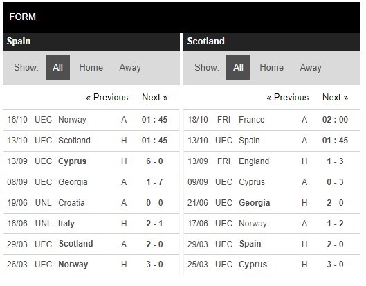 Thống kê phong độ Tây Ban Nha vs Scotland