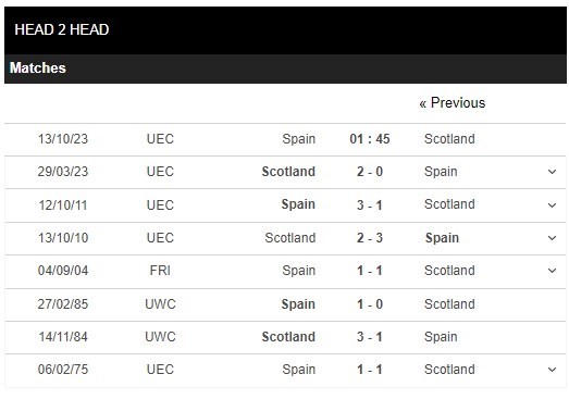 Thống kê đối đầu Tây Ban Nha vs Scotland