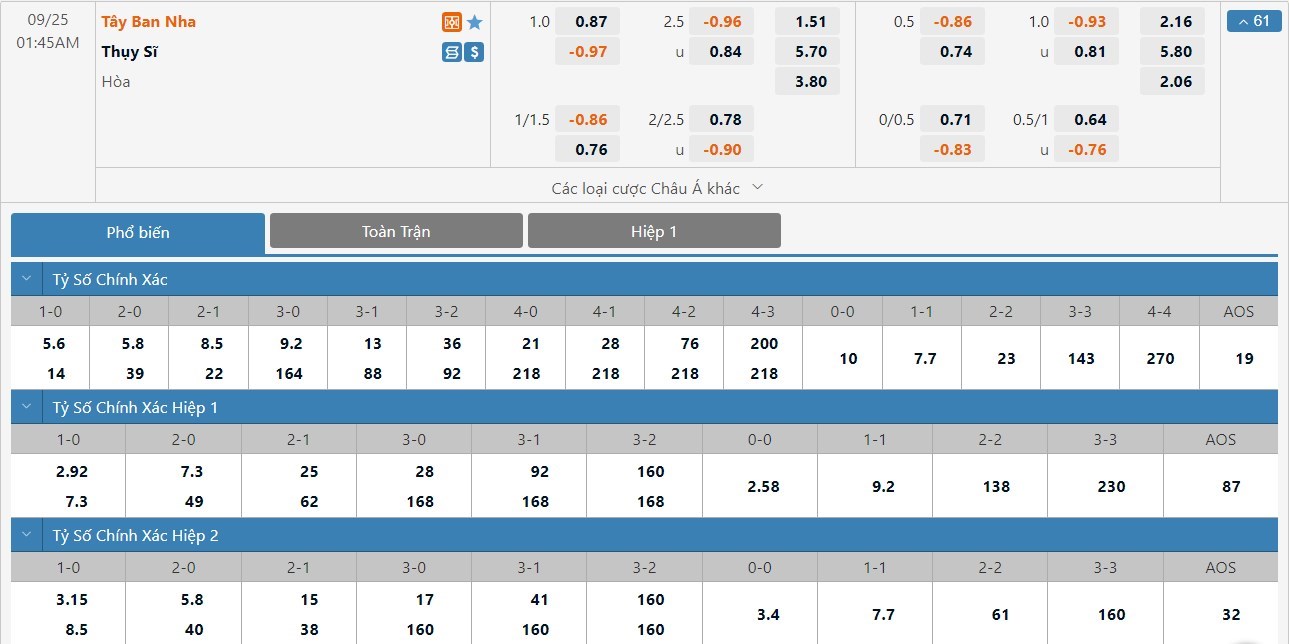 Trong 5 trận đấu gần nhất của mình, Tây Ban Nha đã có 5 trận đấu mang về được cho mình ít nhất là 1 bàn thắng trong hiệp đấu đầu tiên. Còn với Thụy Sĩ, đội bóng này cũng cũng đã có được 2 lần sút tung lưới đối phương trong 45 phút đầu tiên. Với tỷ lệ kèo hiệp 1 ở trận đấu này được đưa ra là -1/2 trái, người chơi nên tin tưởng vào đội chủ nhà trận này.