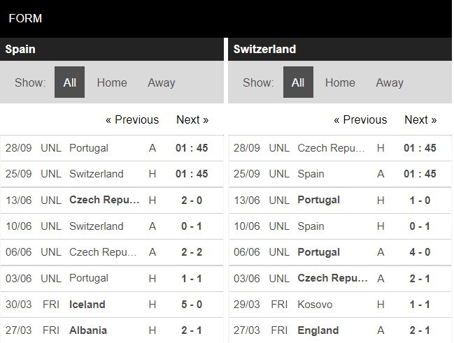 Thống kê phong độ Tây Ban Nha vs Thụy Sĩ