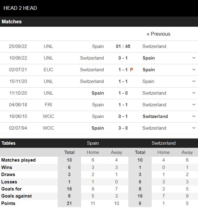 Thống kê đối đầu Tây Ban Nha vs Thụy Sĩ