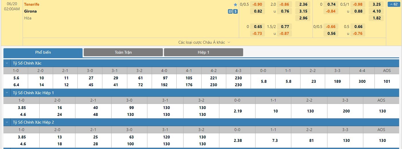 Xem tỷ lệ kèo cá cược bóng đá trực tuyến Tenerife vs Girona