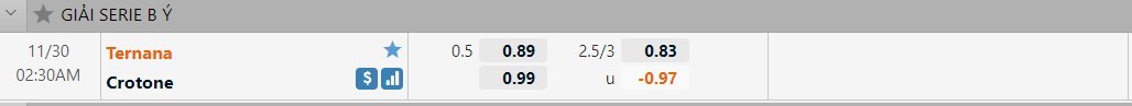 Tỷ lệ kèo cá cược bóng đá trực tuyến trận Ternana vs Crotone