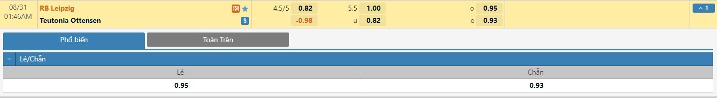 Tỷ lệ kèo cá cược bóng đá trực tuyến trận Teutonia Ottensen vs RB Leipzig