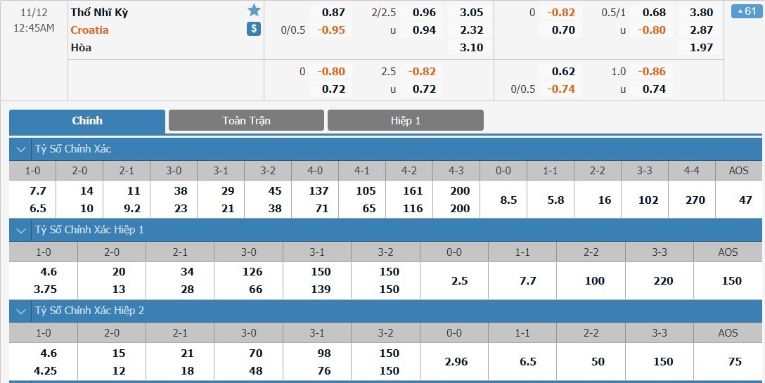 Tỷ lệ kèo cá cược bóng đá trận Thổ Nhĩ Kỳ vs Croatia