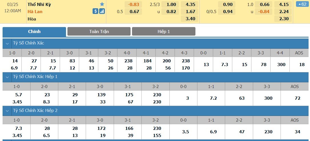 Xem tỷ lệ kèo cá cược bóng đá trực tuyến Thổ Nhĩ Kỳ vs Hà Lan