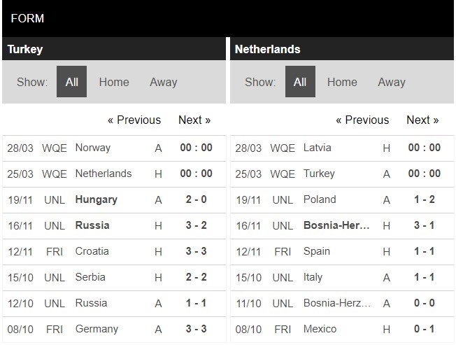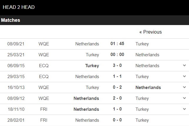 Kể từ năm 2015 đến nay, hai đội chưa từng chạm trán với nhau. Thời gian từ đó đến nay đã có nhiều sự chuyển biến và sức mạnh của Thổ Nhĩ Kỳ rõ ràng là lép vế so với "Cơn lốc màu da cam". Những gì mà Thổ Nhĩ Kỳ thể hiện tại kỳ Nations League diễn ra vào năm ngoái cũng cho thấy rằng họ không thể gây khó cho Hà Lan vào thời điểm này. Trong 8 trận gần đây, Thổ Nhĩ Kỳ chỉ có được 1 chiến thắng. Ở chiều ngược lại, Hà Lan đã bắt đầu trên con đường tìm lại vị thế của mình sau quãng thời gian tái thiết lực lượng. Theo chuyên gia phân tích thị trường cá cược Lucky88, Hà Lan thắng kèo châu Á 4/5 trận gần nhất. Thống kê 4/5 màn đối đầu gần đây giữa hai đội khép lại mà không vượt quá 2 bàn mỗi trận.