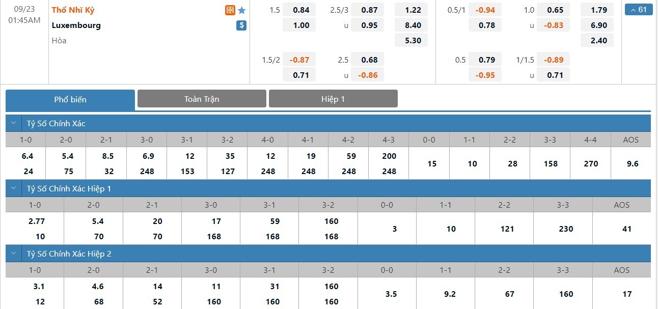 Tỷ lệ kèo cá cược bóng đá trận Thổ Nhĩ Kỳ vs Luxembourg