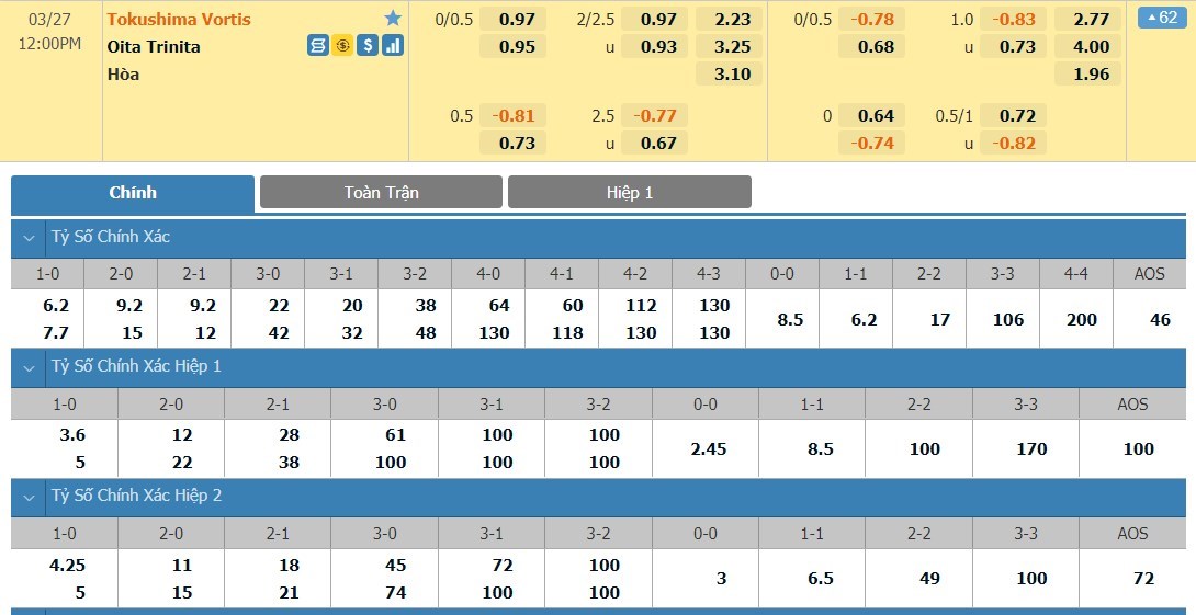 Tỷ lệ kèo cá cược bóng đá trận Tokushima Vortis vs Oita Trinita