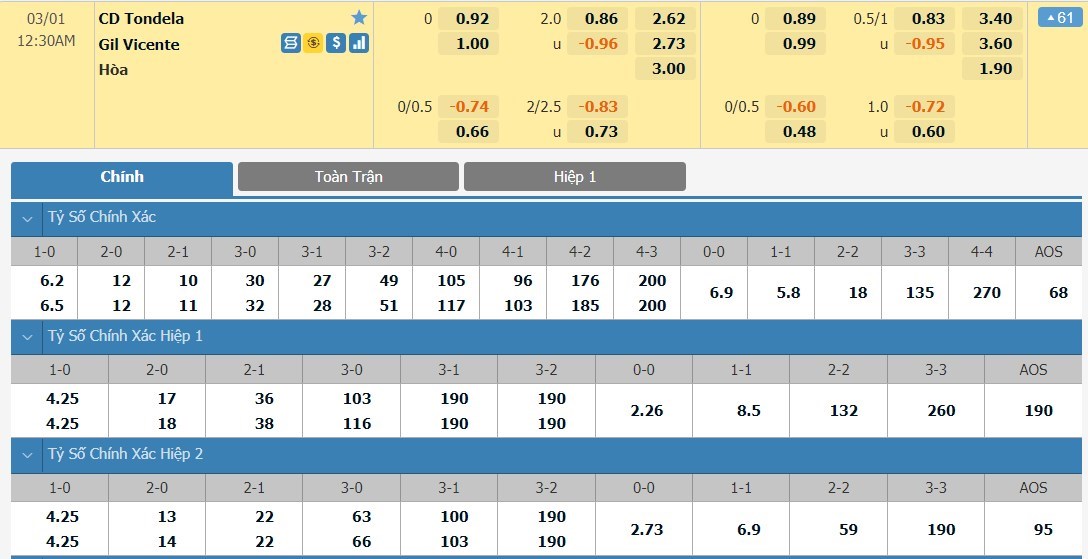 Tỷ lệ kèo cá cược bóng đá trận Tondela vs Gil Vicente