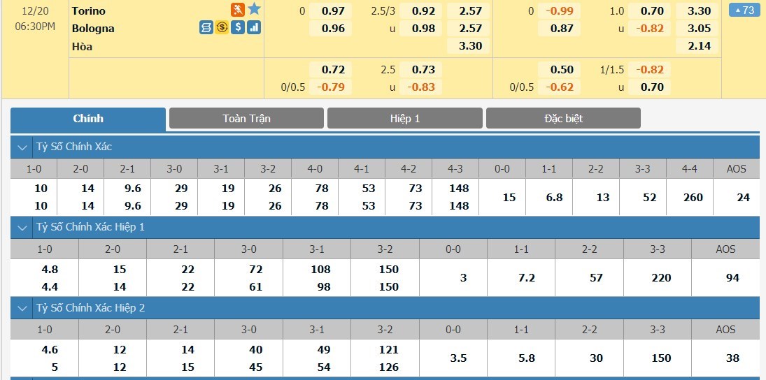Tỷ lệ kèo cá cược bóng đá trận Torino vs Bologna