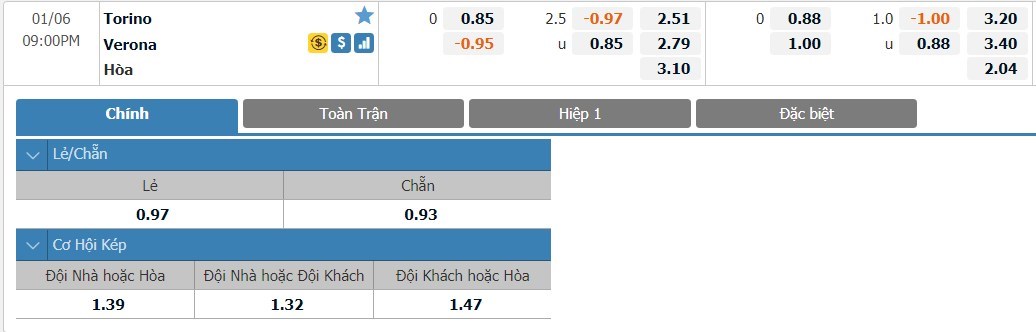 Tỷ lệ kèo cá cược bóng đá trận Torino vs Hellas Verona