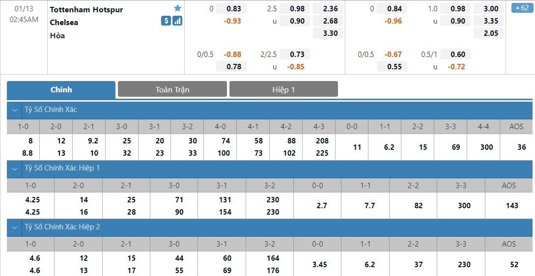 Tỷ lệ kèo cá cược bóng đá trực tuyến trận Tottenham vs Chelsea