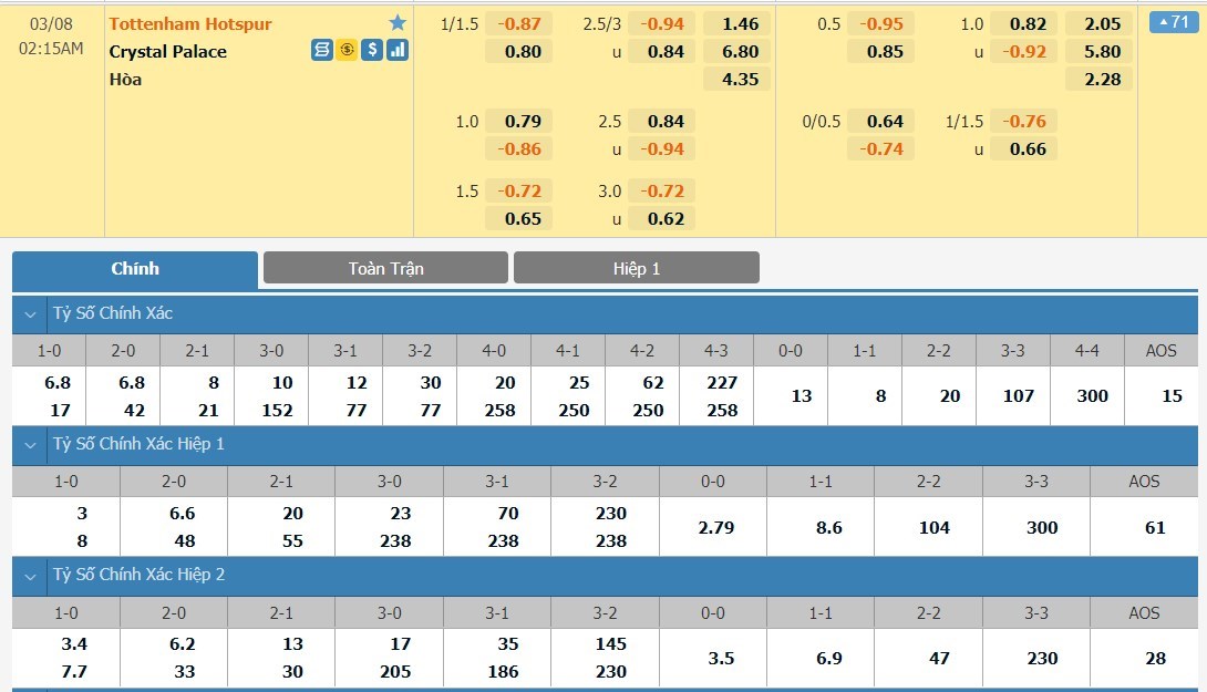 Chu kỳ lên xuống tỷ lệ kèo Tottenham vs Crystal Palace