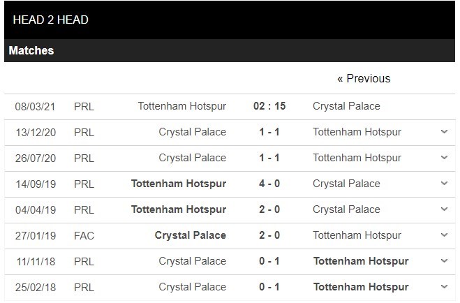 Thống kê đối đầu Tottenham vs Crystal Palace